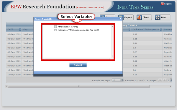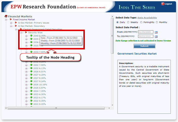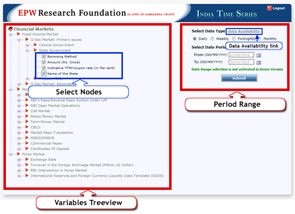 After login you will get the following screen. You will get variables in tree view on the left side of the screen and you can expand the nodes as per requirement and select the variables. Also You will get period range section on right side of the screen (in demo version, you will not be able to change the date selection). Now Select the nodes and click on "Submit" button.