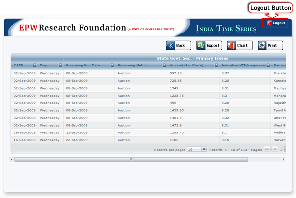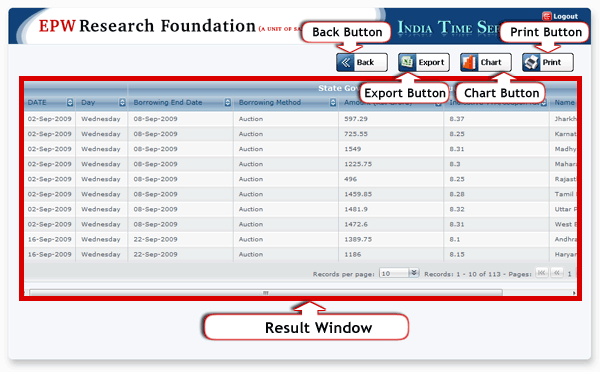 Data Availability Link: There is one more link in "Period Range" section, written as a "Data Availability Link". After clicking this link, following window will appear. This window will show the list of Time Series data available in this website.